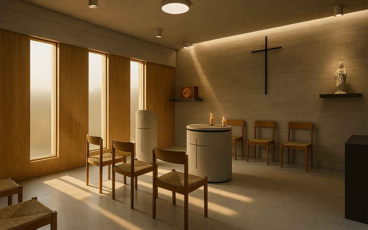 Espaços de fé e contemplação. Uma arquitetura que usa luz, forma e materialidade para criar ambientes de introspecção e elevação espiritual.